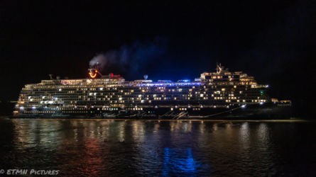 Beeindruckend war auch das Ablegemanöver. Da das Schiff mit dem Bug in Richtung Bremen lag, war eine 360 Grad Drehung nötig um die Weser in Richtung Nordsee verlassen zu können. Das erledigte die MEIN SCHIFF 2, direkt vor der Besuchergalerie recht souverän und ohne Schlepperhilfe. Recht eindrücklich wenn der Bug eines 300m Schiffs so genau auf einen zeigt. Ist schwer in Worte zu fassen und kommt auch auf den Bildern nicht so ganz rüber. Auch das Schiffshorn wurde der Größe des Schiff’s mehr als gerecht. Dazu habe ich etwas weiter unten auch noch ein kurzes Video eingefügt. Zusätzlich wurde das Schiff mit 3 Salutschüssen von Land verabschiedet, worauf das Schiff mit „einmal kurz“ antwortete.